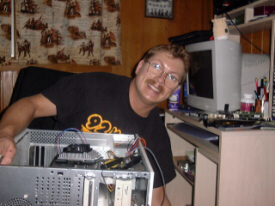 So..Here he is, elbow deep in computer guts..See how happy he looks?